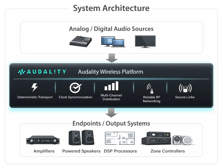 Supports multi-channel uncompressed audio (stereo through 7.1 and beyond) across distributed endpoints.